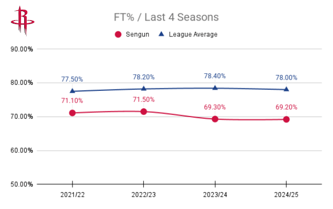 For instance, this 2024/25 regular season he shot a total of 707 FT, converting 436 of them. If instead, he became a ~80% FT shooter, he would have made 566/707 – 130 more points.