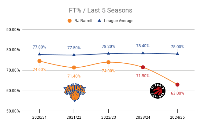 RJ Barrett stated that one of the main reasons for the sharp drop in FT% is fatigue. He knows he had better averages other years and that he’s capable of reaching those. With that statement, RJ now has to at least match or even surpass his best FT% season. There’s a full off-season ahead where he will be able to work on them and a full NBA season next year to back up his words.
