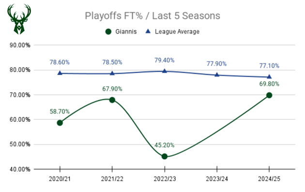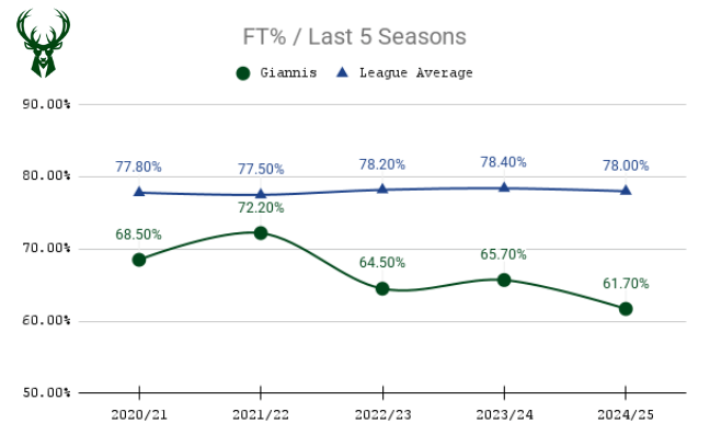 While shooting a similar amount of FT, Giannis consistently worsened his percentage year by year. Reaching his peak in 2021/22 at 72%, the next years it was closer to 65% until this year, his worst with less than 62%. And of course this is reflected in his playoffs percentages.