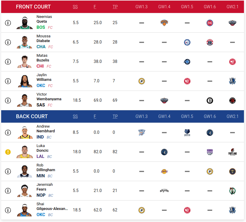 Same case as Shai, he played the first day of the week. Apart from that, he’s alone in this Lakers team. That fact has two faces: he can either be a hero or get injured because of playing so many minutes. For now, I trust him. In his season debut he almost got a triple double and is currently leading the whole NBA in FTPS with 82.
